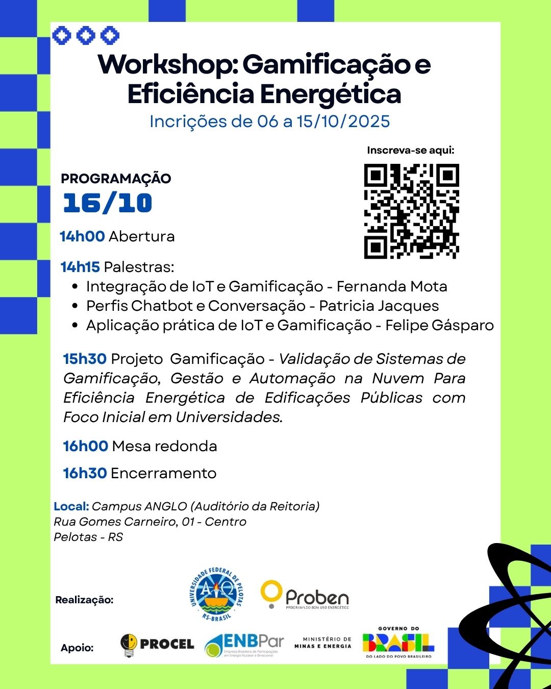 Até quarta-feira (15), a comunidade acadêmica poderá se inscrever na oficina “Gamificação e Eficiência Energética”, oferecida pelo Programa de Bom Uso Energético (Proben) da Universidade Federal de Pelotas (UFPel). A atividade será desenvolvida na tarde de quinta-feira (16), a partir das 14h, no auditório da Reitoria (4º andar do câmpus Anglo). As inscrições são recebidas por formulário eletrônico.